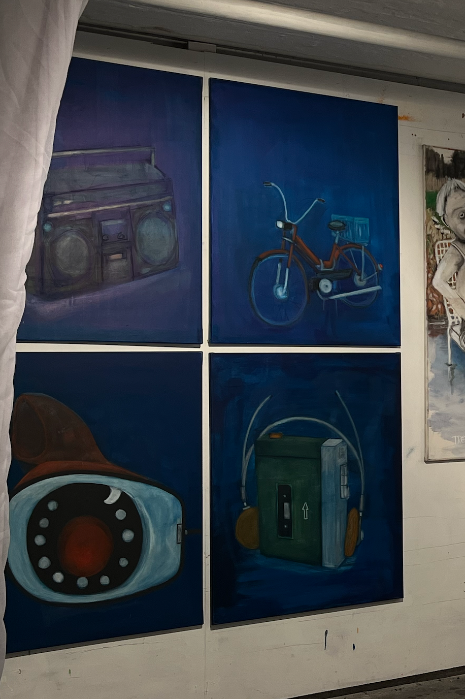 In the series Memories, A. Breiner reflects on the objects that carry our recollections and tie us to particular moments in life. The bicycle, the reel-to-reel tape recorder, and the boombox emerge from a field of blue tones like silhouettes from a distant past—objects that are both every day and iconic. The shades of blue create a dreamy, almost melancholic atmosphere, where memories seem to drift between the clear and the blurred. The forms remain recognizable, yet never fully fixed—mirroring memory itself, which preserves impressions as fragments and sensations rather than precise detail. Here, the objects become more than mere things: the bicycle as a symbol of freedom and youth, the tape recorder as an archive of voices and sound, and the boombox as an emblem of community and musical culture. Together, the series unfolds as a poetic reflection on time, nostalgia, and the material witnesses to both our personal and collective history.